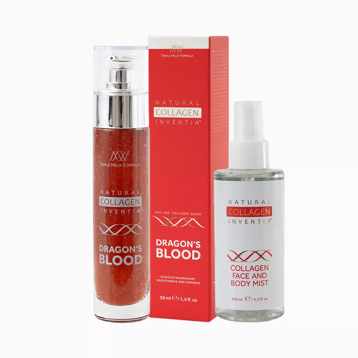HNejnovější přírůstek do rodiny živého kolagenu nové generace – anti-age omlazující a regenerační sérum s živým kolagenem a dračí krví představuje unikátní spojení nejvzácnějšího hydrátu nativního kolagenu z ryb zpracovaný autorskou technologií Inventia – Triple Helix Formula a magické ingredience – tzv. Dračí krve – tmavě červené mízy ze vzácného Dračího stromu.